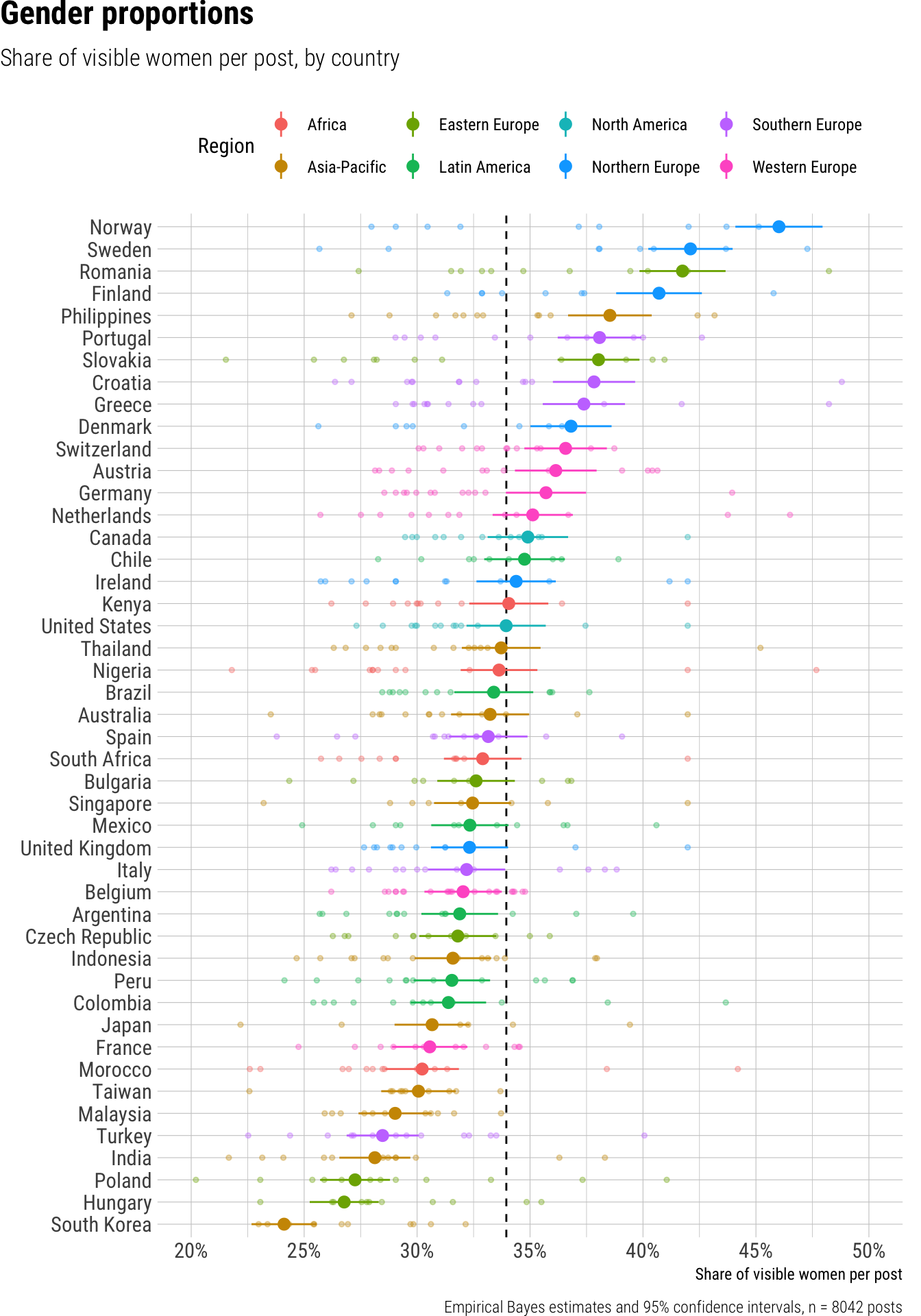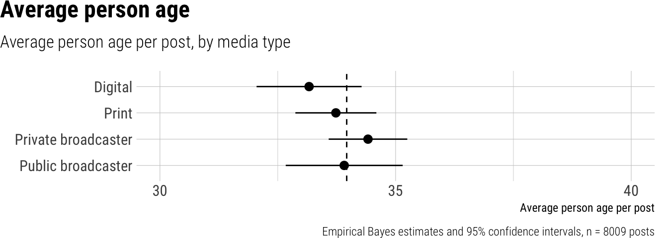 The analysis of short video posts from news outlets revealed that, on average, women constituted 34% of visible individuals in these posts. We observed variations across platforms and outlet types. Looking at platforms, YouTube Shorts featured the lowest proportion of visible women at 29%, which was significantly lower than Instagram’s 34%. TikTok had a slightly higher share at 36%, but this difference from Instagram was not statistically significant. When examining outlet types, public broadcasters and digital outlets showed slightly higher proportions of visible women, at approximately 37% and 36% respectively, while private broadcasters and print outlets were lower, around 32% and 33%. Specifically, private broadcasters displayed a significantly smaller share of visible women compared to digital outlets. Furthermore, we saw substantial variability across countries, with the share of visible women ranging from a low of 24% in South Korea to a high of 46% in Norway.