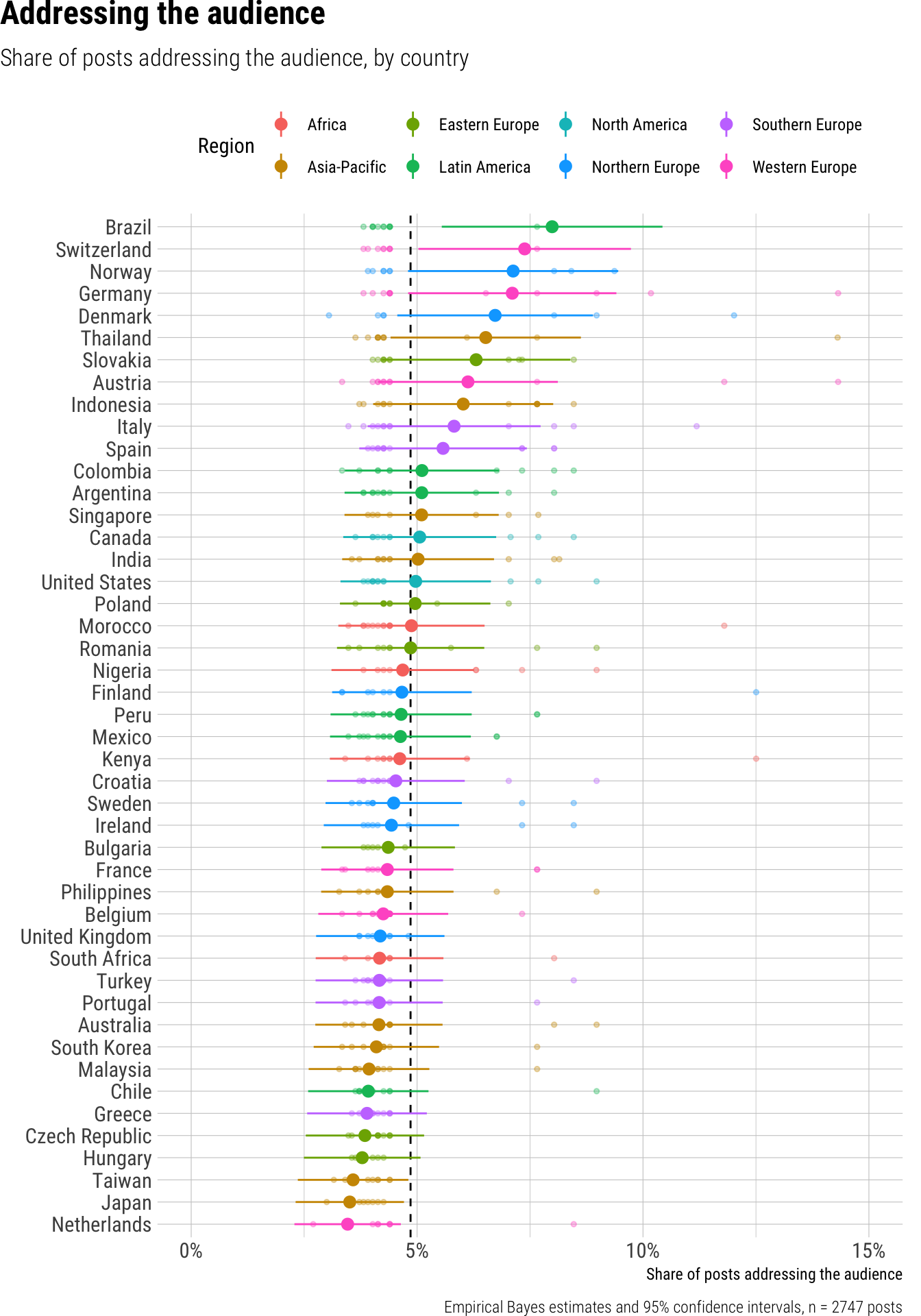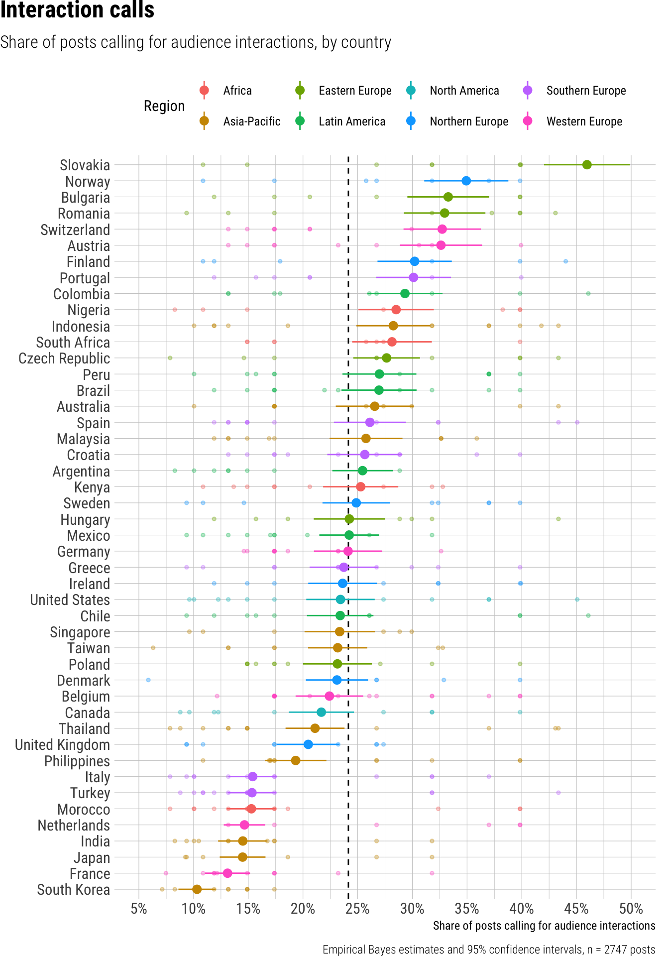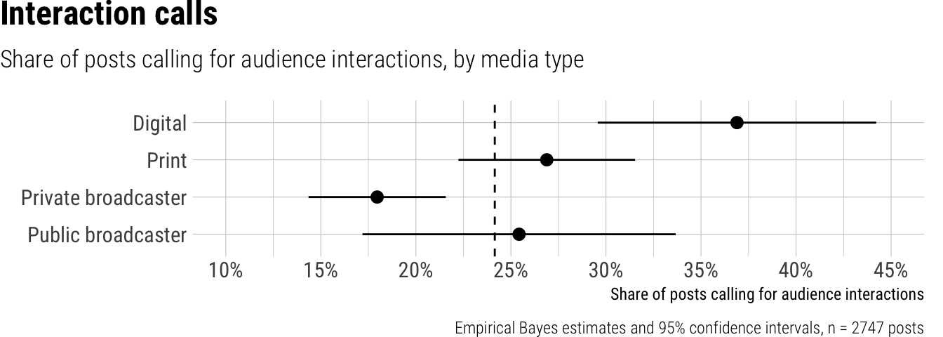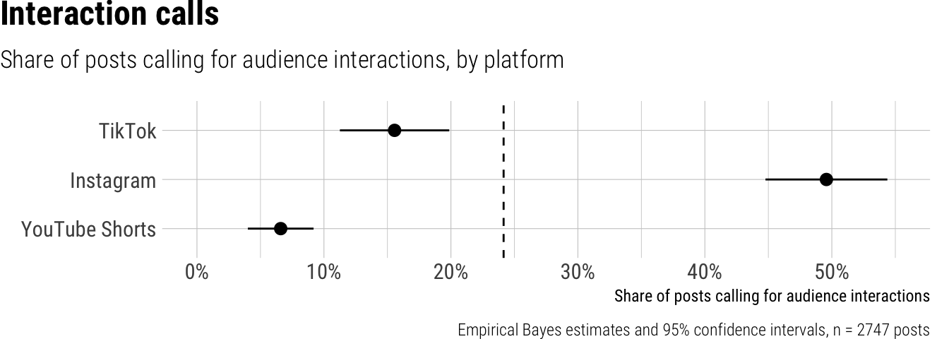 Overall, we observed that 24% of short video posts from news outlets across different platforms worldwide called for audience interactions. A closer look at specific platforms revealed substantial and statistically significant differences: posts on Instagram had the highest call for interaction at 50%, significantly more than posts on TikTok (16%), while YouTube Shorts posts were the least likely to include such calls, at just 7%. We found significant variation among outlet types as well; digital-native outlets encouraged interaction in 37% of their posts, a notably higher proportion compared to private broadcasters (18%) and public broadcasters (25%). Print outlets, with 27%, fell between these groups. Furthermore, the prevalence of interaction calls varied considerably by country, ranging from a low of 10% in South Korea to a high of 46% in Slovakia.