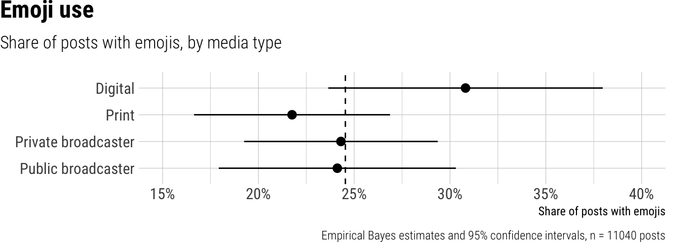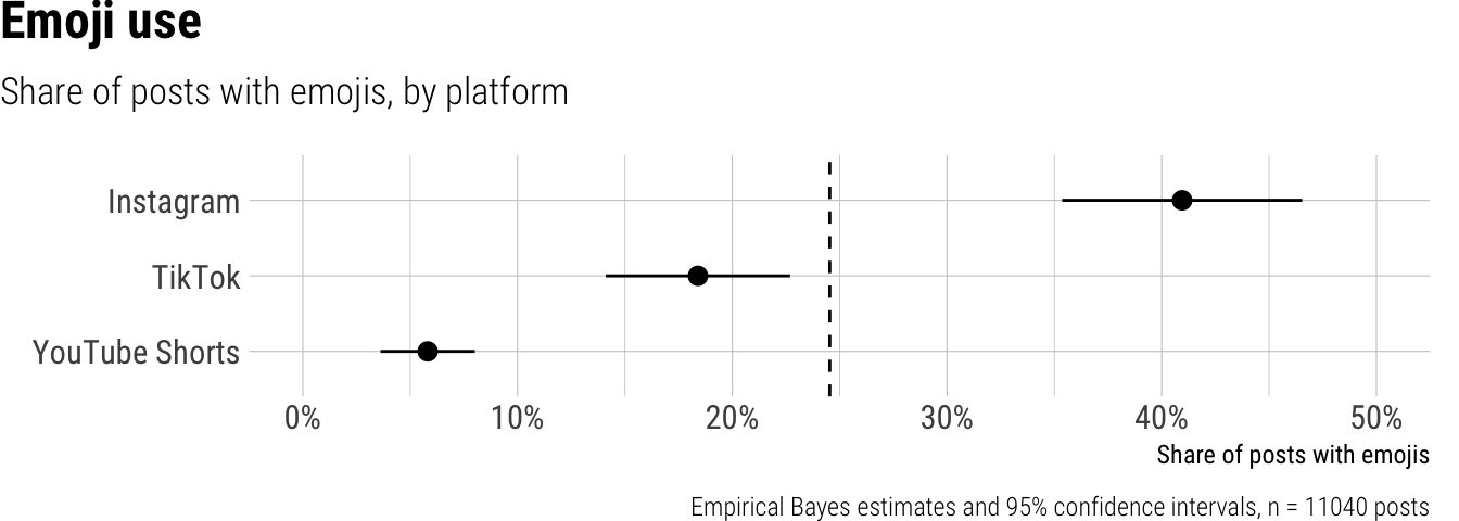 We observed that, on average, approximately 25% of short video news posts included emojis. This usage varied significantly across platforms: posts on Instagram featured emojis most frequently, appearing in 41% of videos, a substantially higher rate than on TikTok (18%) and YouTube Shorts (6%). We found only small and non-significant differences in emoji use among different outlet types, such as digital-only news organizations, print outlets, private broadcasters, and public broadcasters. Emoji adoption also varied widely by country, ranging from a low of 2% in Japan and Malaysia to a high of 63% in the Czech Republic and Spain.