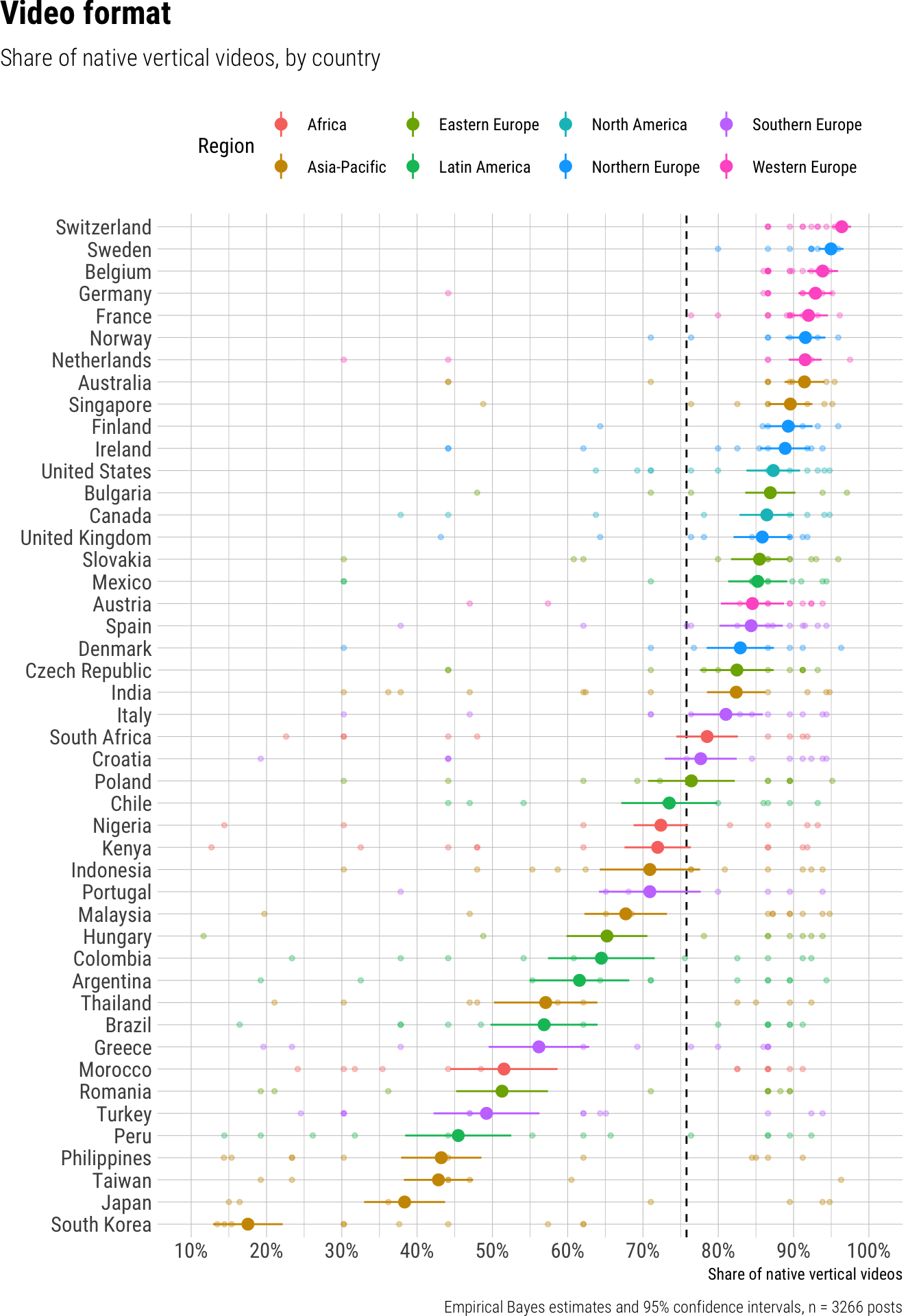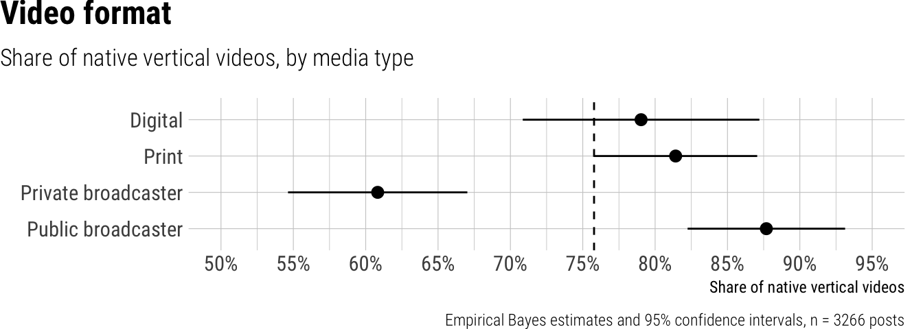 We analyzed the share of native vertical videos posted by news outlets on various platforms, observing that 76% of all short video posts were in the native vertical format. While the overall adoption was high, there were notable differences across platforms, outlet types, and countries. On platforms, TikTok had the highest share with 79% of its videos being native vertical, followed by YouTube Shorts at 75%, and Instagram slightly lower at 71%. Significant differences emerged by outlet type: public broadcasters led with 88% native vertical videos, and print outlets and digital native outlets closely followed around 80-81%. In contrast, private broadcasters showed a substantially lower adoption, with only 61% of their videos being native vertical. Furthermore, the share of native vertical videos varied widely by country, from a low of 18% in South Korea to a high of 96% in Switzerland.