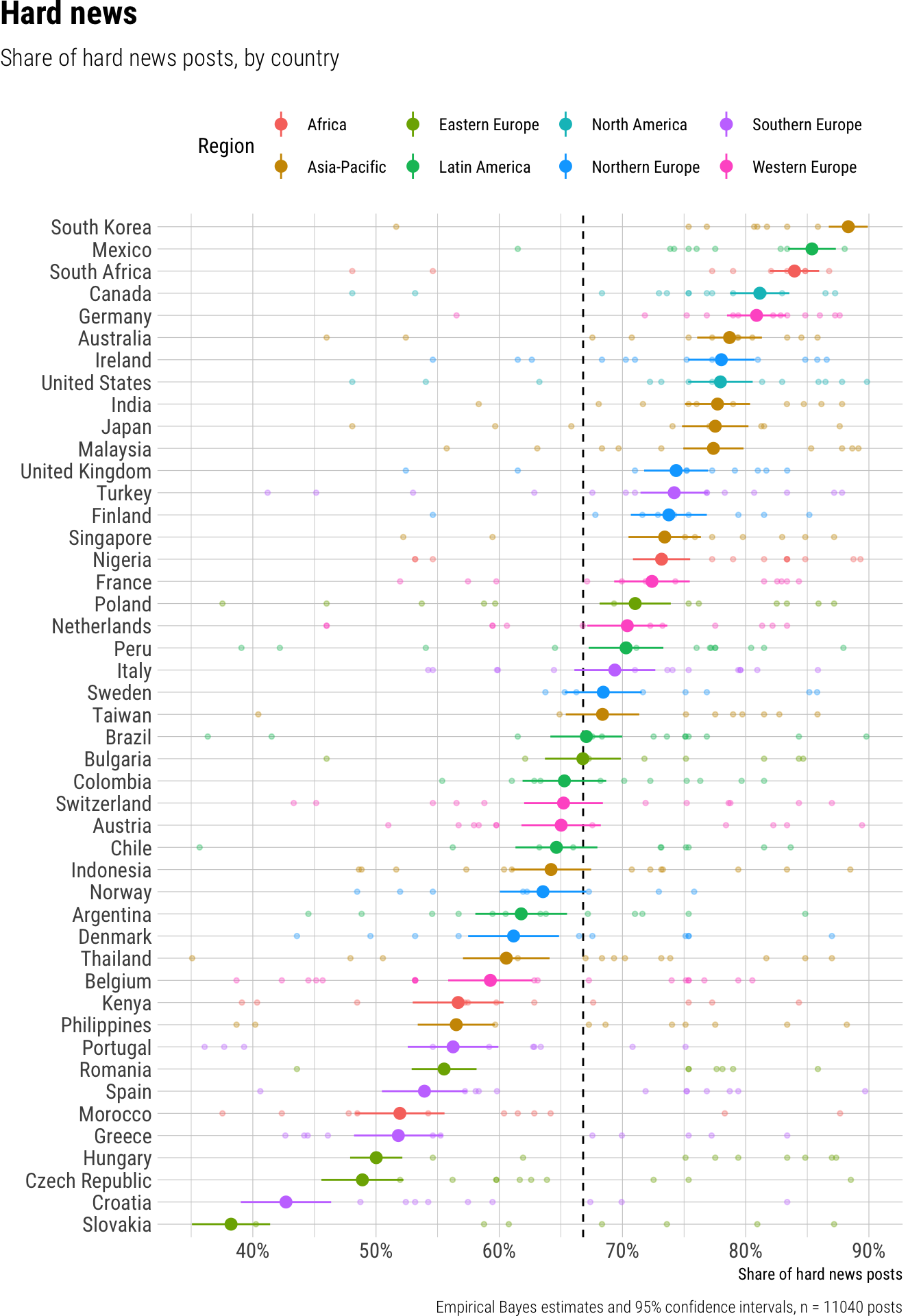 Overall, 67% of short news videos posted by news outlets featured hard news content. Regarding platform, we observed a significant difference: YouTube Shorts displayed hard news in 75% of posts, substantially higher than Instagram’s 64%, while posts on TikTok (at 66%) were not significantly different from Instagram. Differences across outlet types were small and not statistically significant; digital outlets posted hard news in 61% of videos, while print and public broadcasters were slightly higher at 69% each, and private broadcasters at 67%. However, the share of hard news varied considerably by country, ranging from a low of 38% in Slovakia to a high of 88% in South Korea, with other notable highs in Mexico (85%) and Canada (81%).