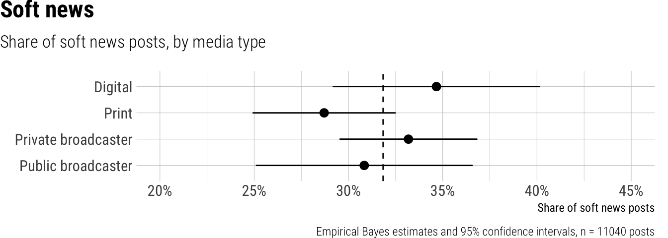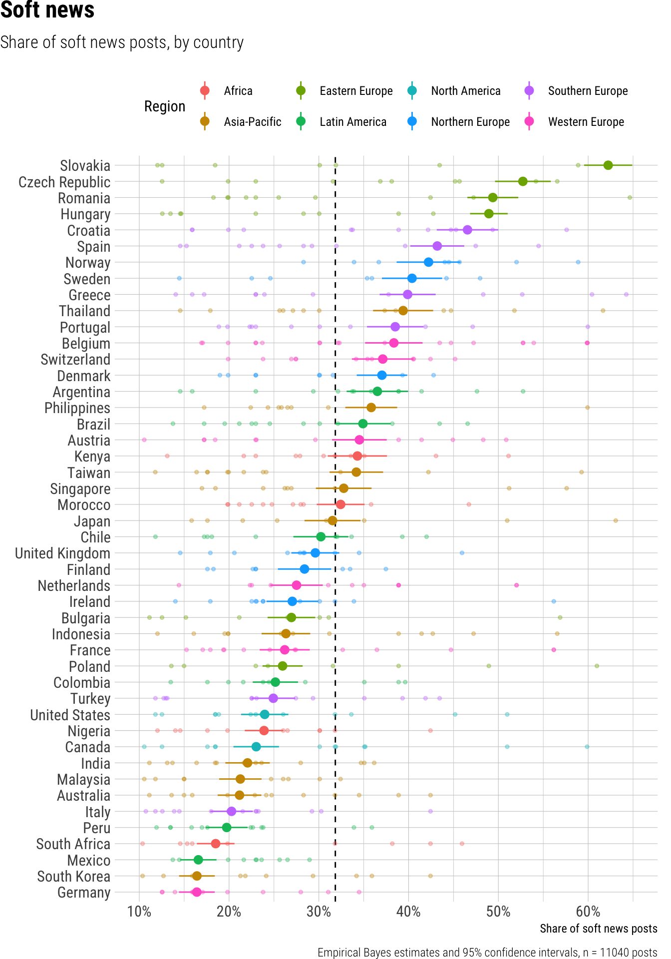 Across all platforms, an average of 32% of short video posts from news outlets were classified as soft news, encompassing entertainment, celebrity, lifestyle, fashion, food, animals, and comedy. We observed notable differences in the share of soft news across platforms, with Instagram featuring the highest proportion at 35%, while YouTube Shorts featured the lowest at 26%, a statistically significant difference. TikTok’s share of soft news posts was 32%. The analysis indicated only small and non-significant differences among various outlet types, including digital outlets, print media, and private or public broadcasters. However, there was a substantial variation in soft news content across different countries; for instance, Germany and South Korea posted the lowest shares, each at 16%, contrasting sharply with Slovakia, where 62% of short video news posts were soft news.