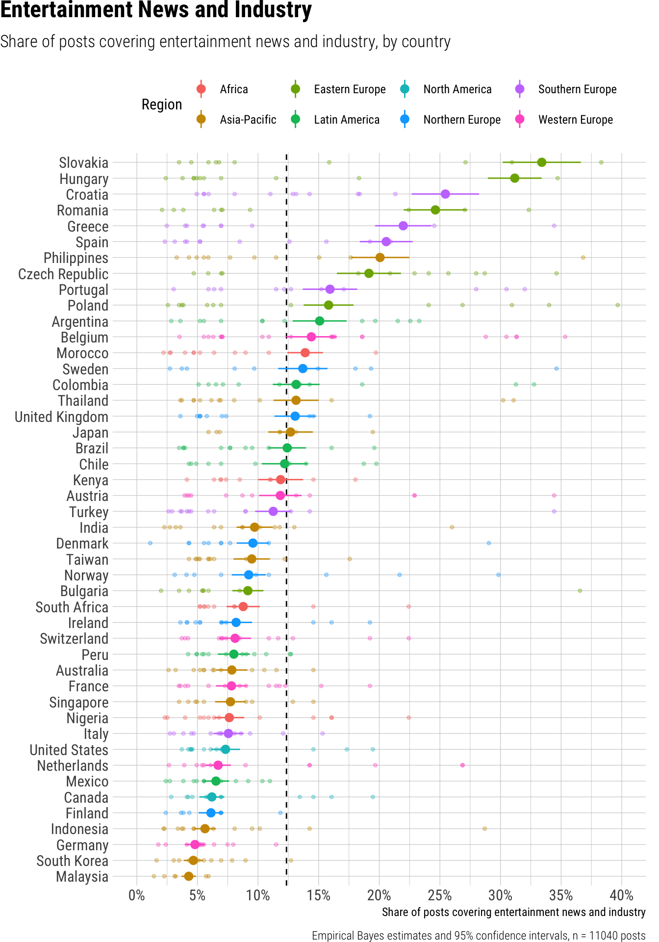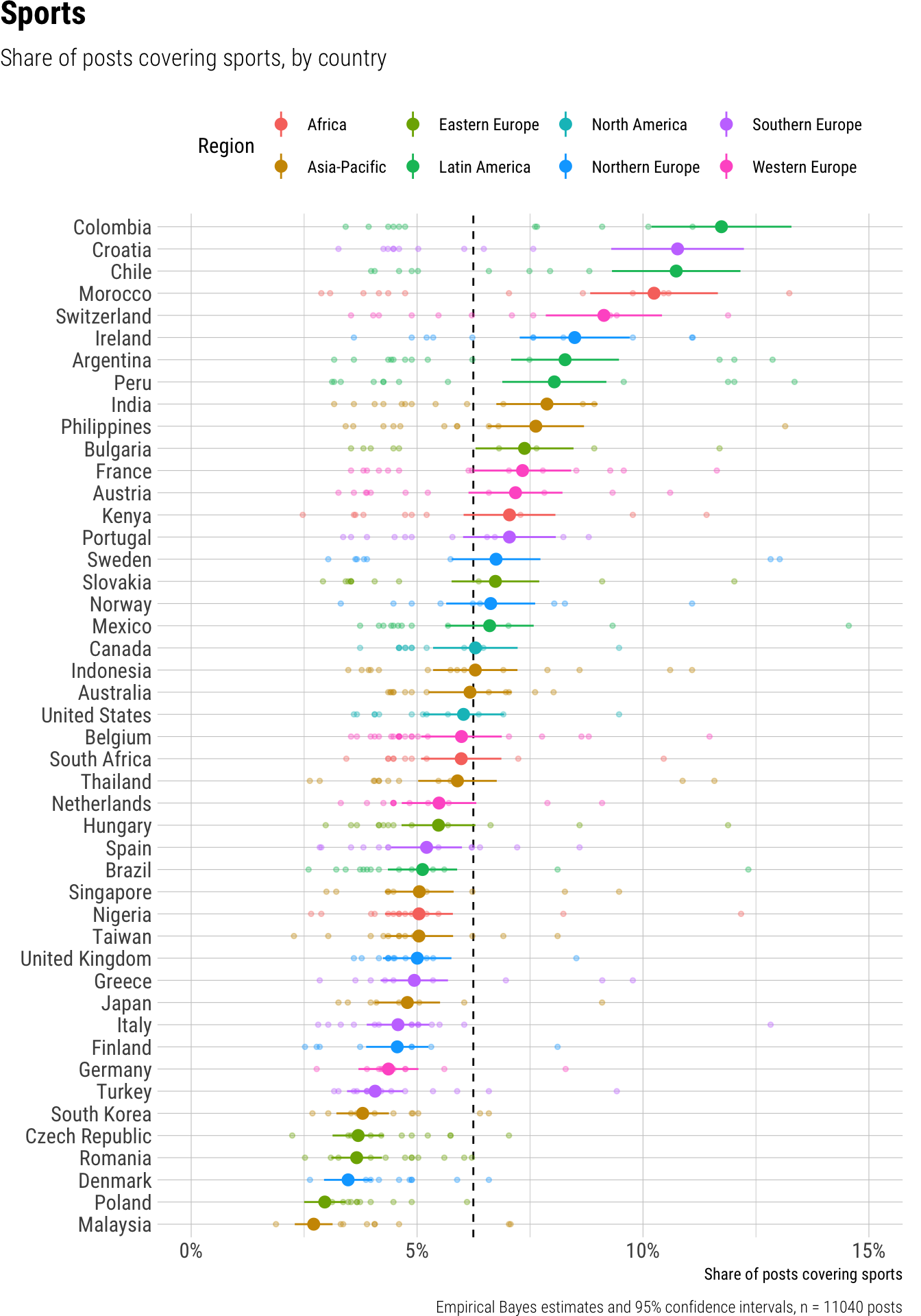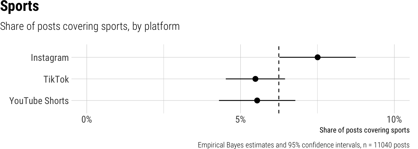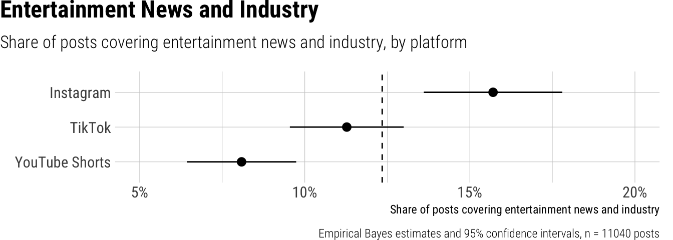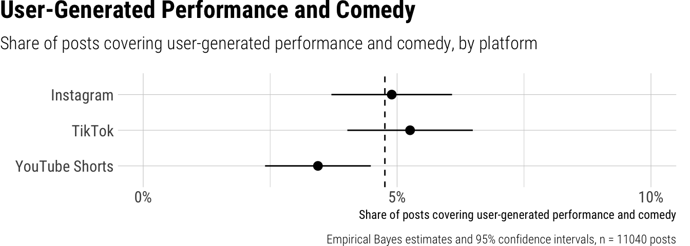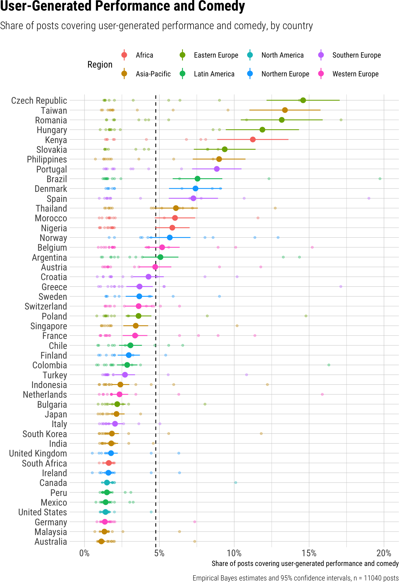Overall, 5% of short video posts published by news outlets covered user-generated performance and comedy. While Instagram and TikTok both saw an average of 5% of posts in this category, we observed a small but statistically significant difference, with TikTok’s share being slightly higher than Instagram’s. YouTube Shorts, by contrast, dedicated a lower 3% of its posts to this content. Looking at outlet types, digital outlets dedicated the largest share of their posts to this content, at 7%, closely followed by private broadcasters at 6%. Print outlets, however, featured this content significantly less, at just 2%, a share similar to public broadcasters at 3%. Country-level differences were substantial, ranging from a low of 1% in countries such as Australia, Canada, Germany, Mexico, Peru, and the United States, to highs of 15% in the Czech Republic, 13% in Romania and Taiwan, 12% in Hungary, and 11% in Kenya.