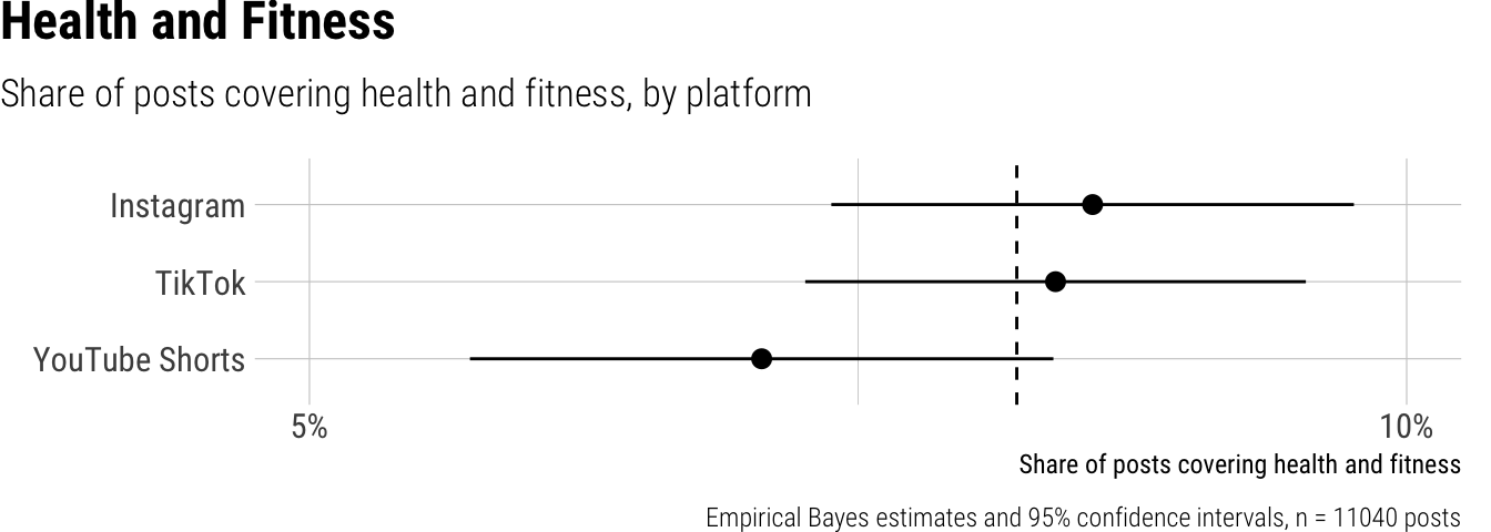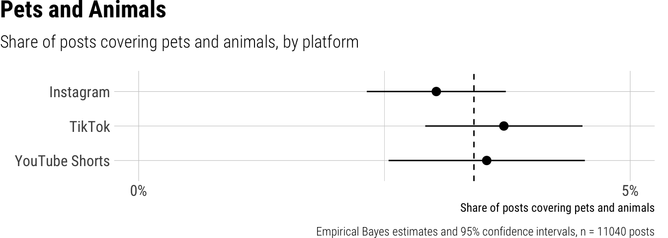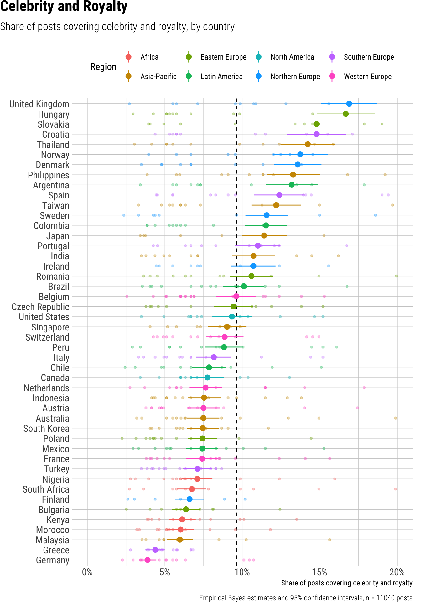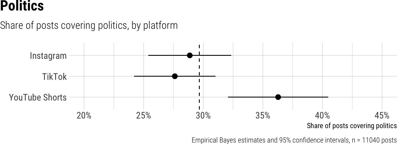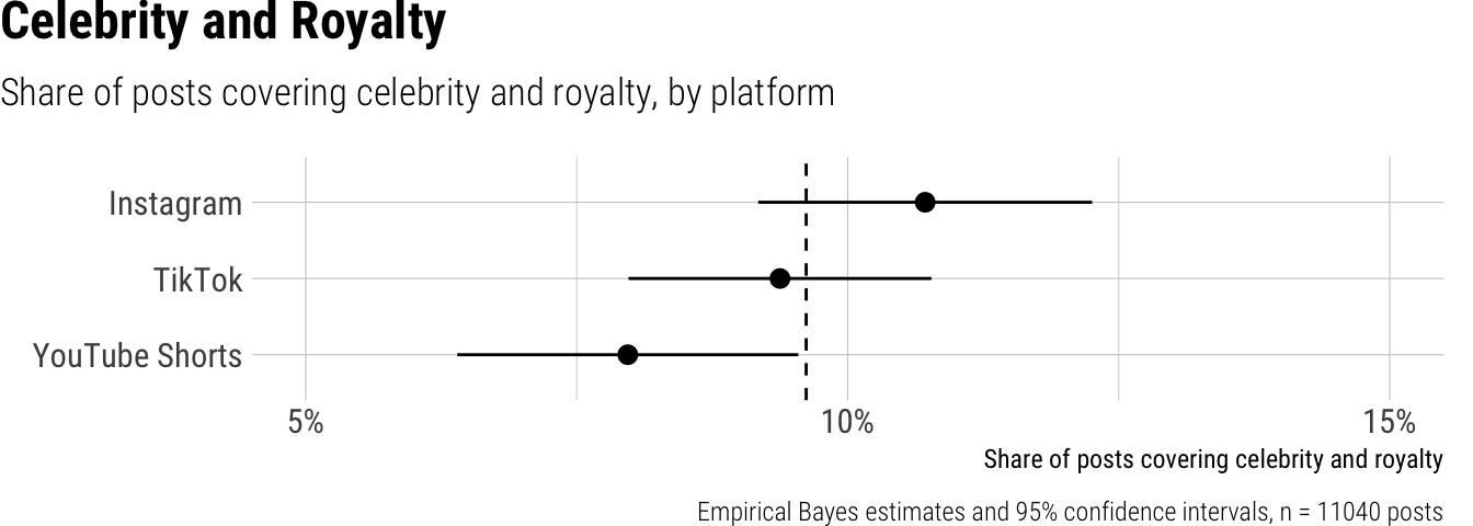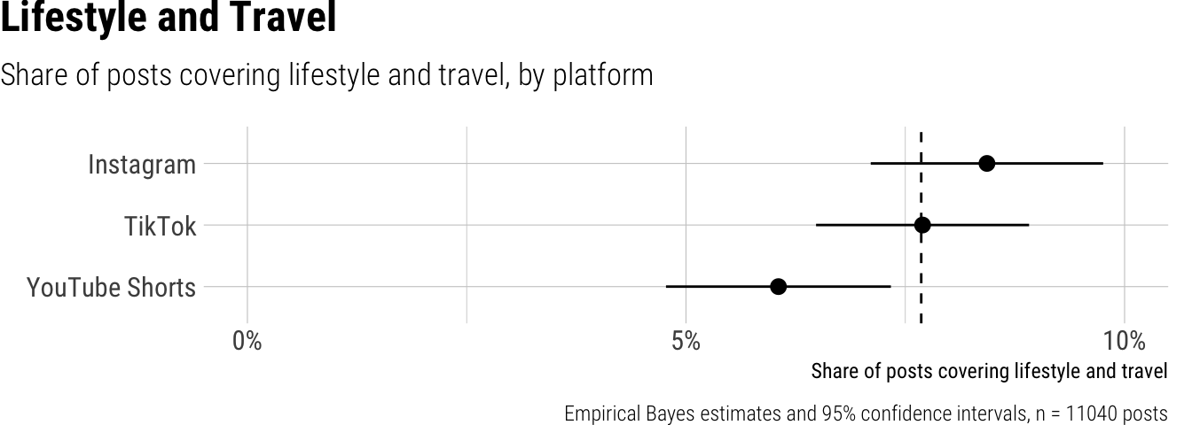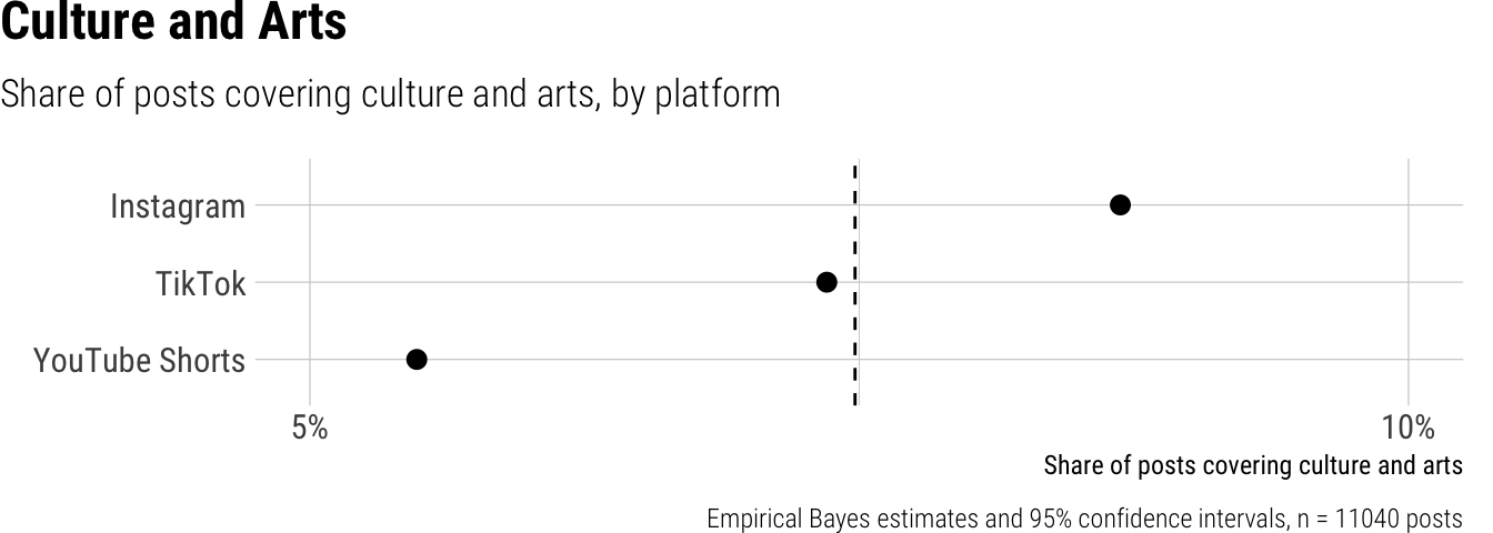 Overall, 5% of short video posts published by news outlets covered user-generated performance and comedy. While Instagram and TikTok both saw an average of 5% of posts in this category, we observed a small but statistically significant difference, with TikTok’s share being slightly higher than Instagram’s. YouTube Shorts, by contrast, dedicated a lower 3% of its posts to this content. Looking at outlet types, digital outlets dedicated the largest share of their posts to this content, at 7%, closely followed by private broadcasters at 6%. Print outlets, however, featured this content significantly less, at just 2%, a share similar to public broadcasters at 3%. Country-level differences were substantial, ranging from a low of 1% in countries such as Australia, Canada, Germany, Mexico, Peru, and the United States, to highs of 15% in the Czech Republic, 13% in Romania and Taiwan, 12% in Hungary, and 11% in Kenya.