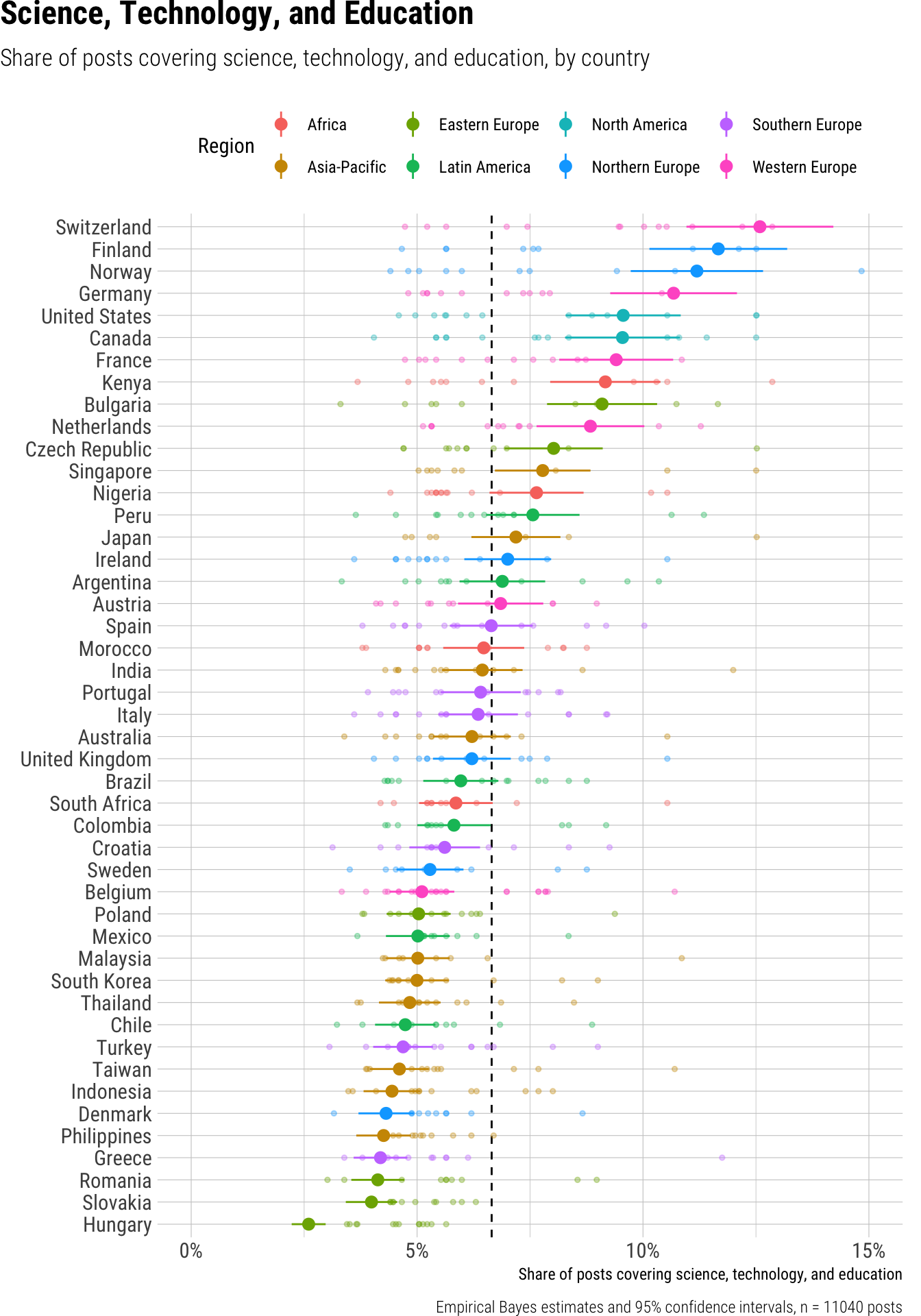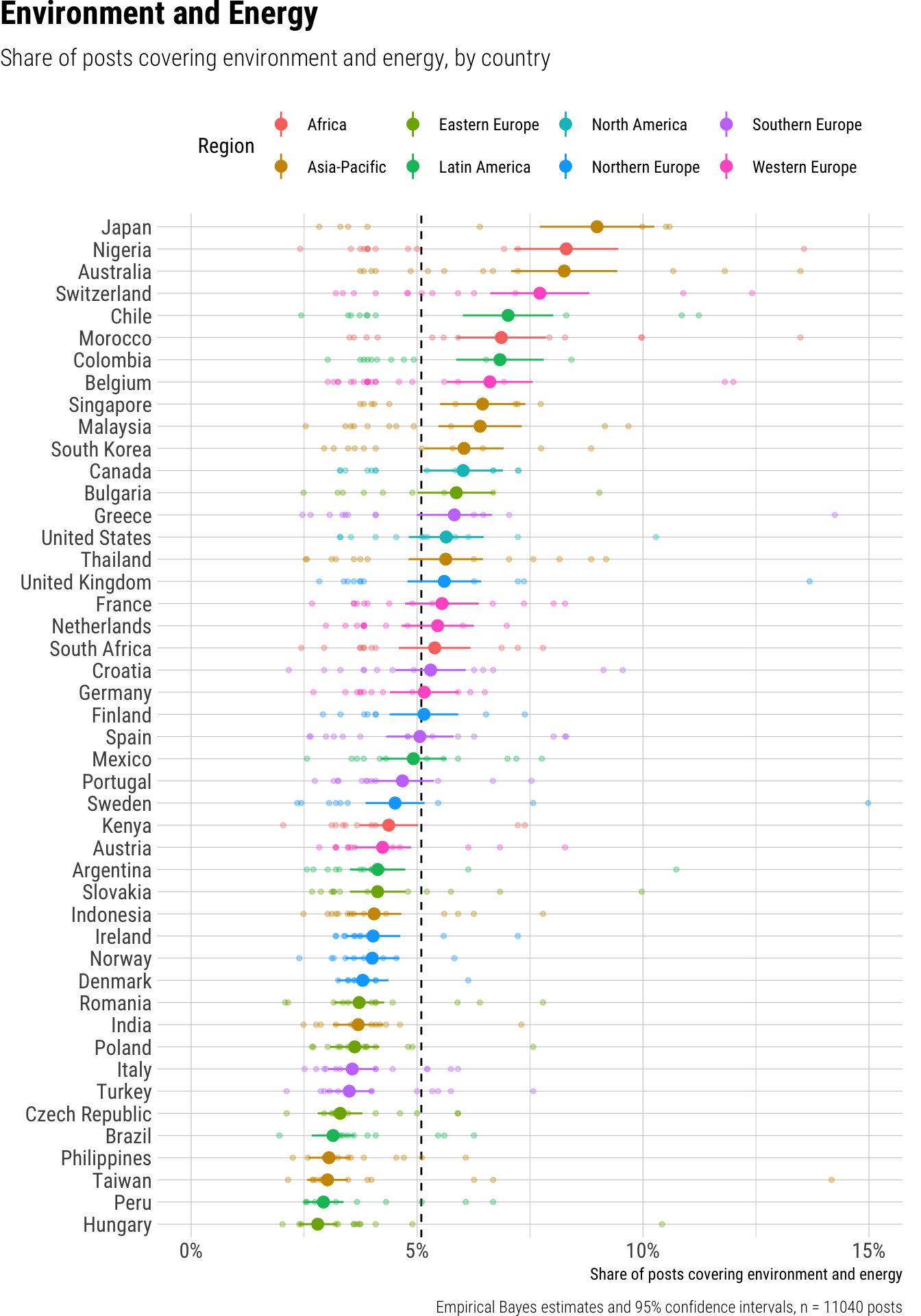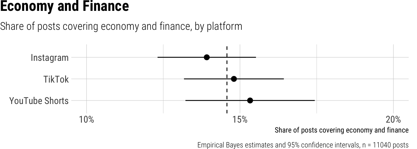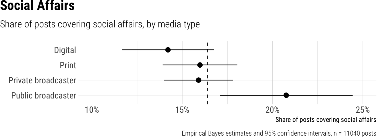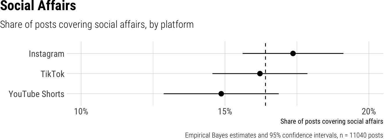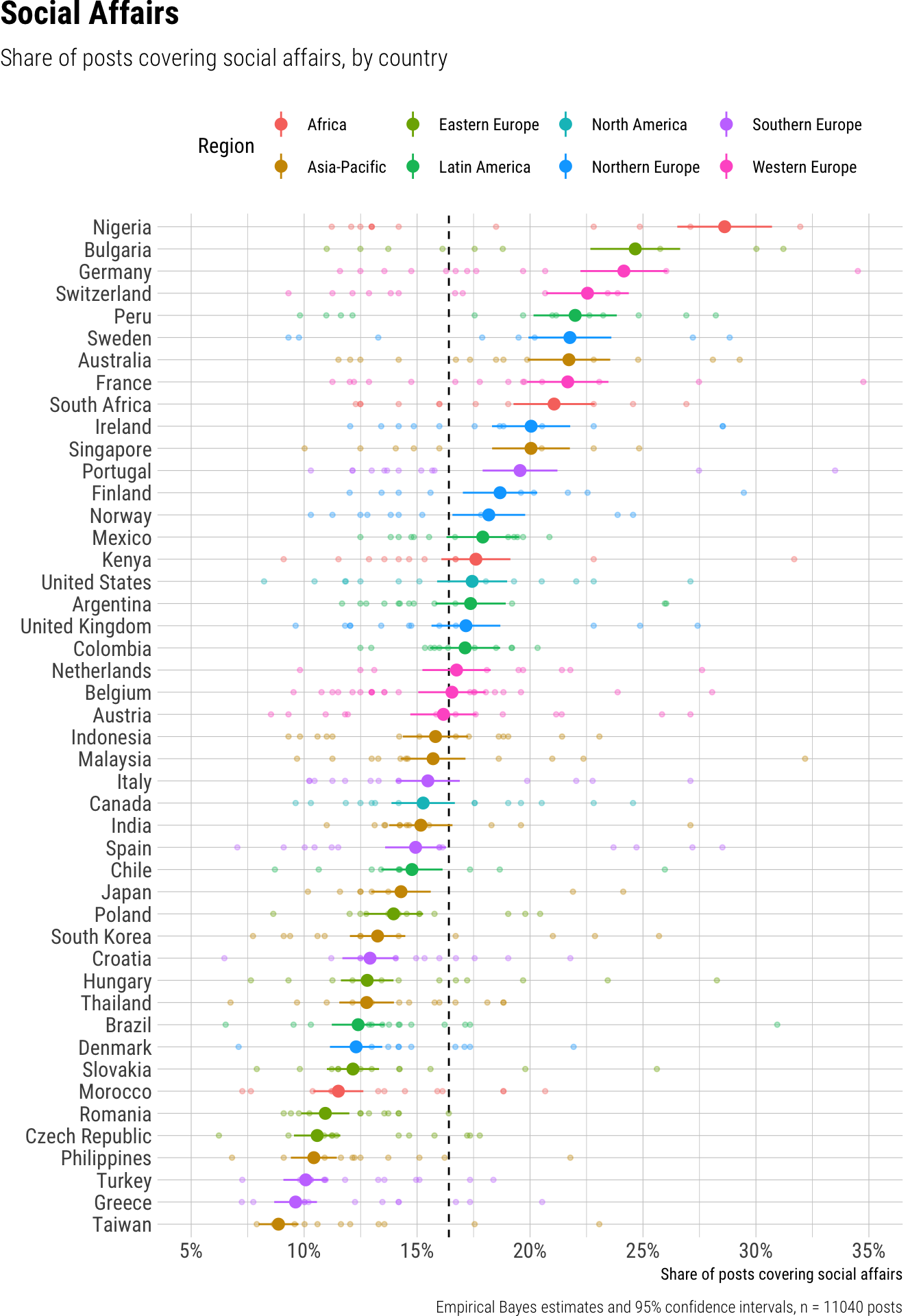 Across news outlets, an average of 16% of short video posts covered social affairs. While differences across platforms were generally small, we observed that Instagram posts contained slightly more social affairs content at 17% compared to YouTube Shorts at 15%, with TikTok at 16% falling in between. More notable differences emerged when examining outlet types: public broadcasters dedicated a significantly larger share of their posts to social affairs, at 21%, whereas digital outlets posted the least at 14%, with print and private broadcasters both around 16%. Country-level variations were substantial, ranging from a low of 9% in Taiwan and 10% in Greece and the Philippines, to a high of 29% in Nigeria, followed by 25% in Bulgaria and 24% in Germany.