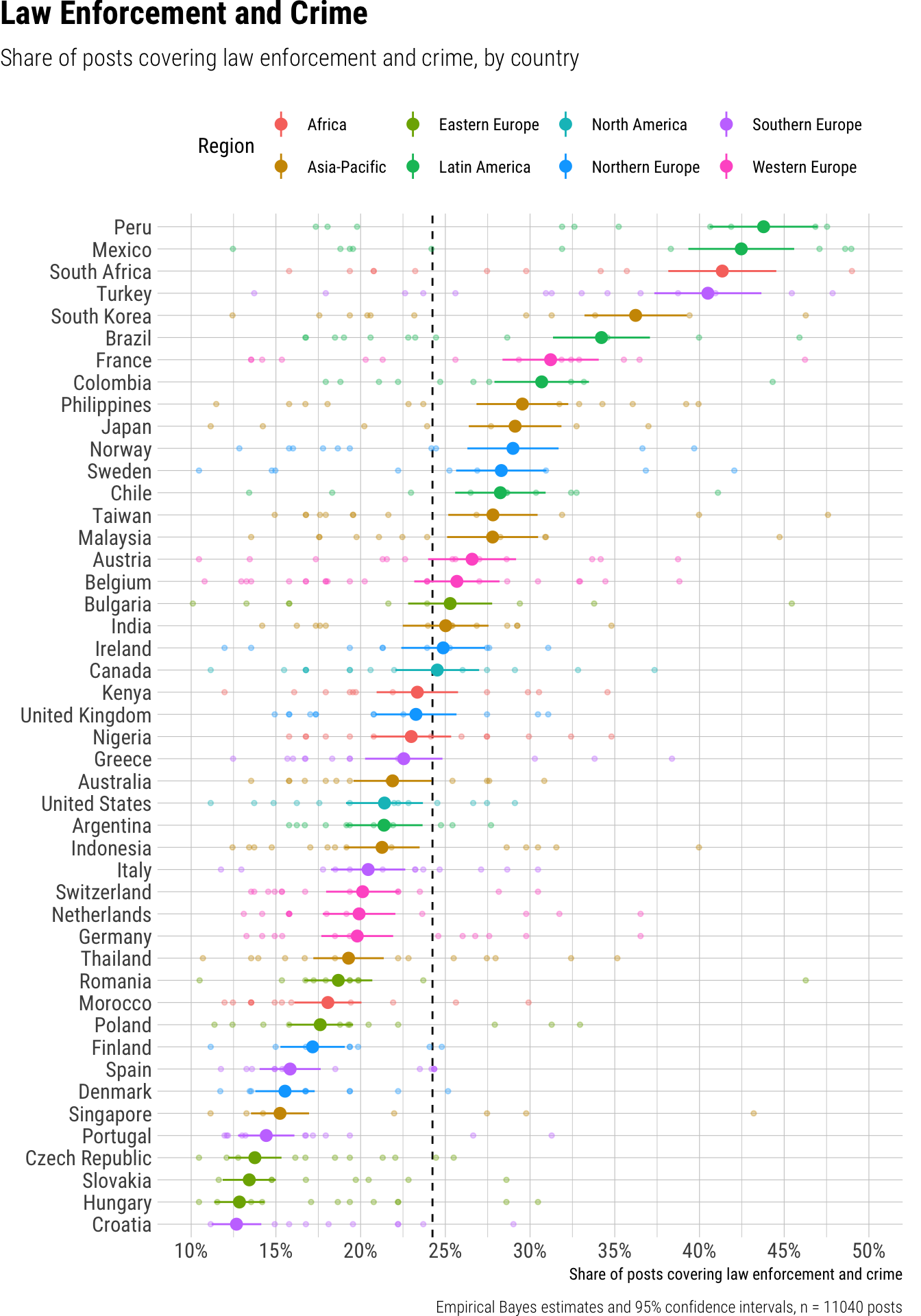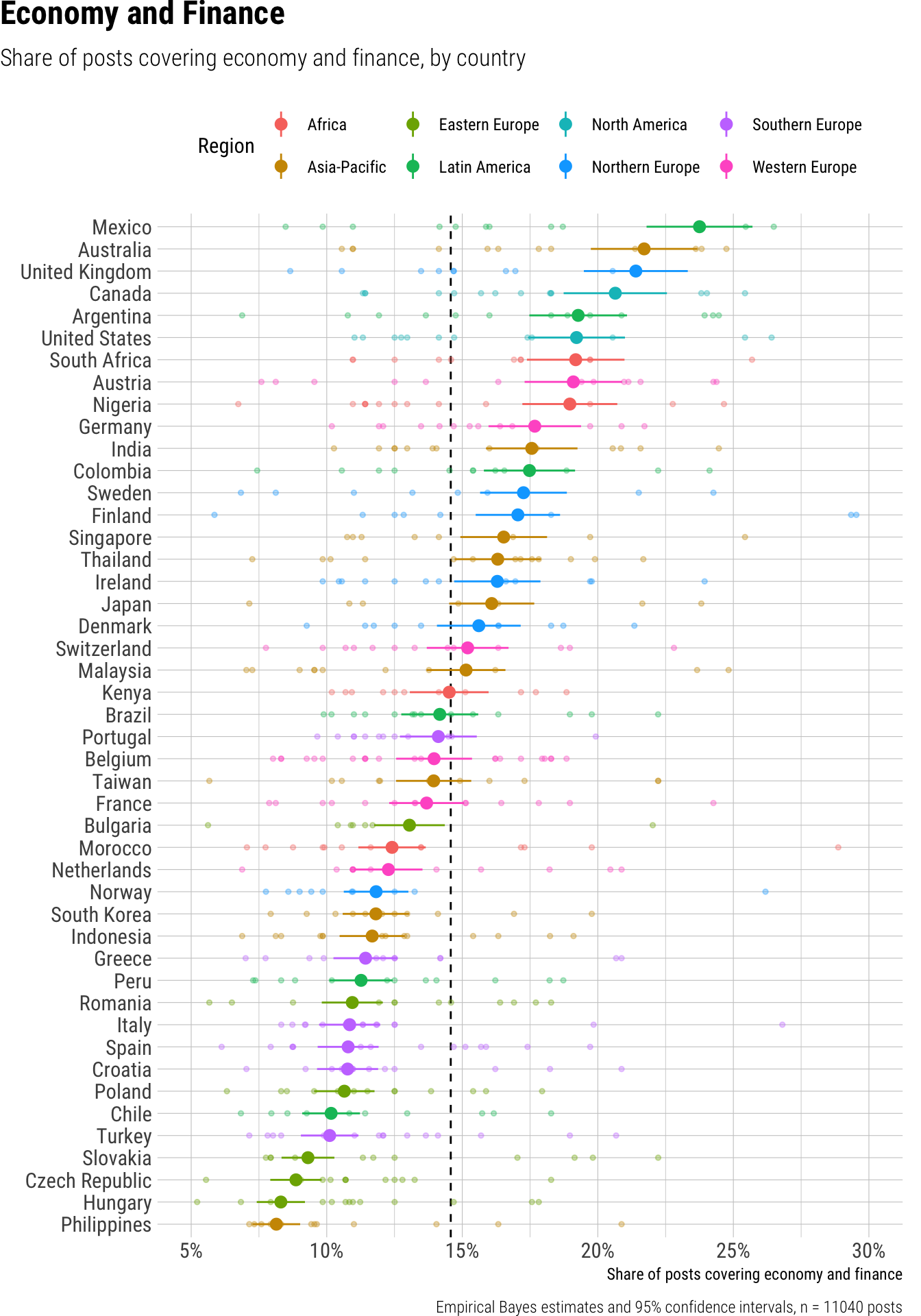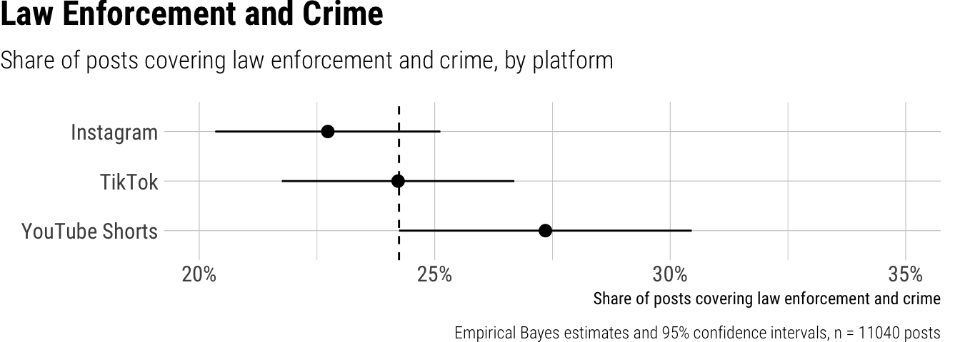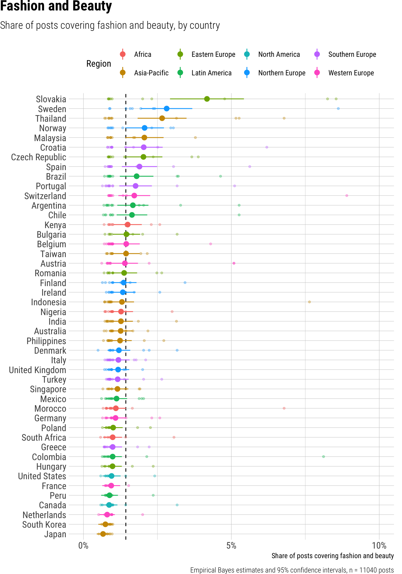 Across news outlets, an average of 16% of short video posts covered social affairs. While differences across platforms were generally small, we observed that Instagram posts contained slightly more social affairs content at 17% compared to YouTube Shorts at 15%, with TikTok at 16% falling in between. More notable differences emerged when examining outlet types: public broadcasters dedicated a significantly larger share of their posts to social affairs, at 21%, whereas digital outlets posted the least at 14%, with print and private broadcasters both around 16%. Country-level variations were substantial, ranging from a low of 9% in Taiwan and 10% in Greece and the Philippines, to a high of 29% in Nigeria, followed by 25% in Bulgaria and 24% in Germany.