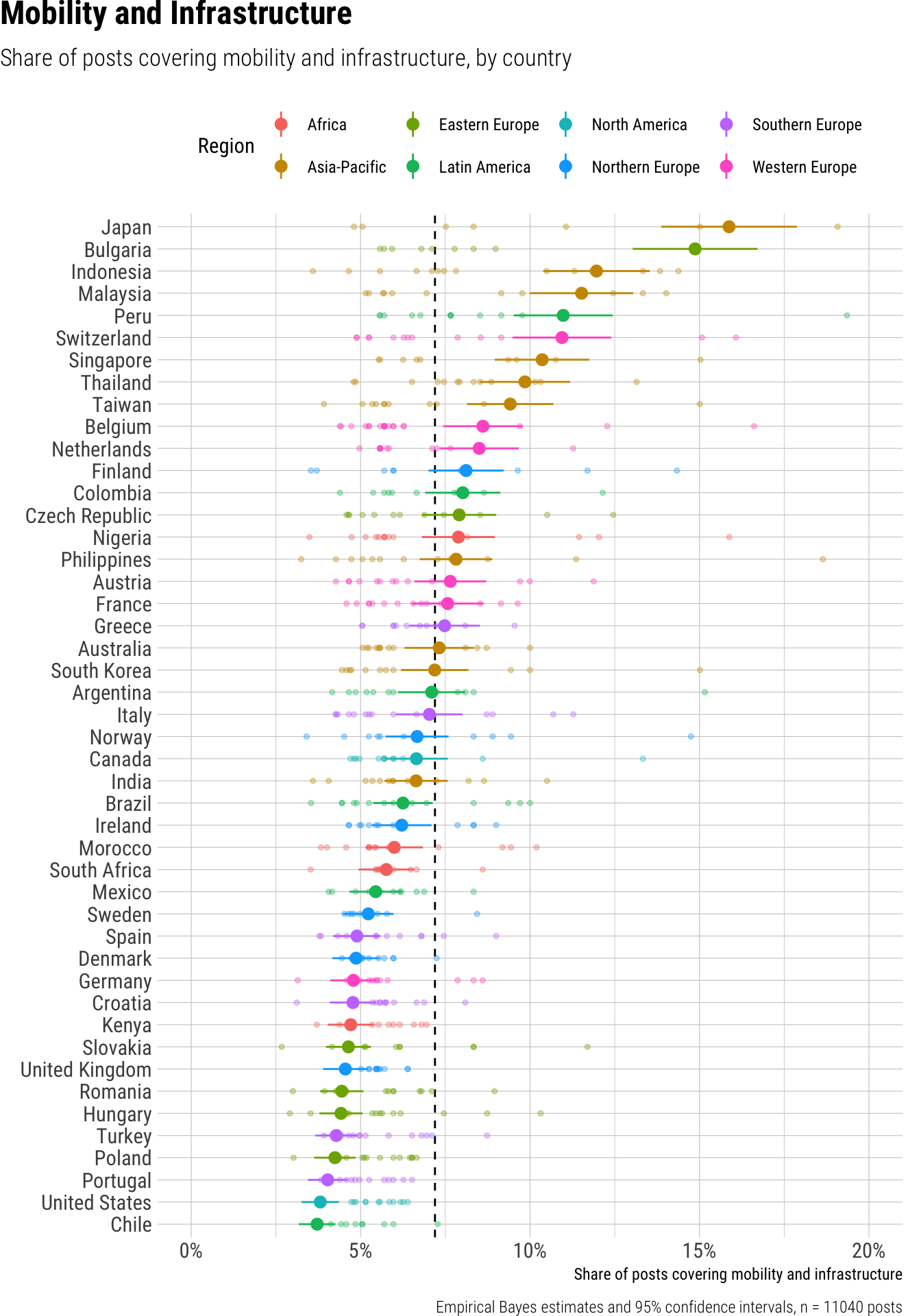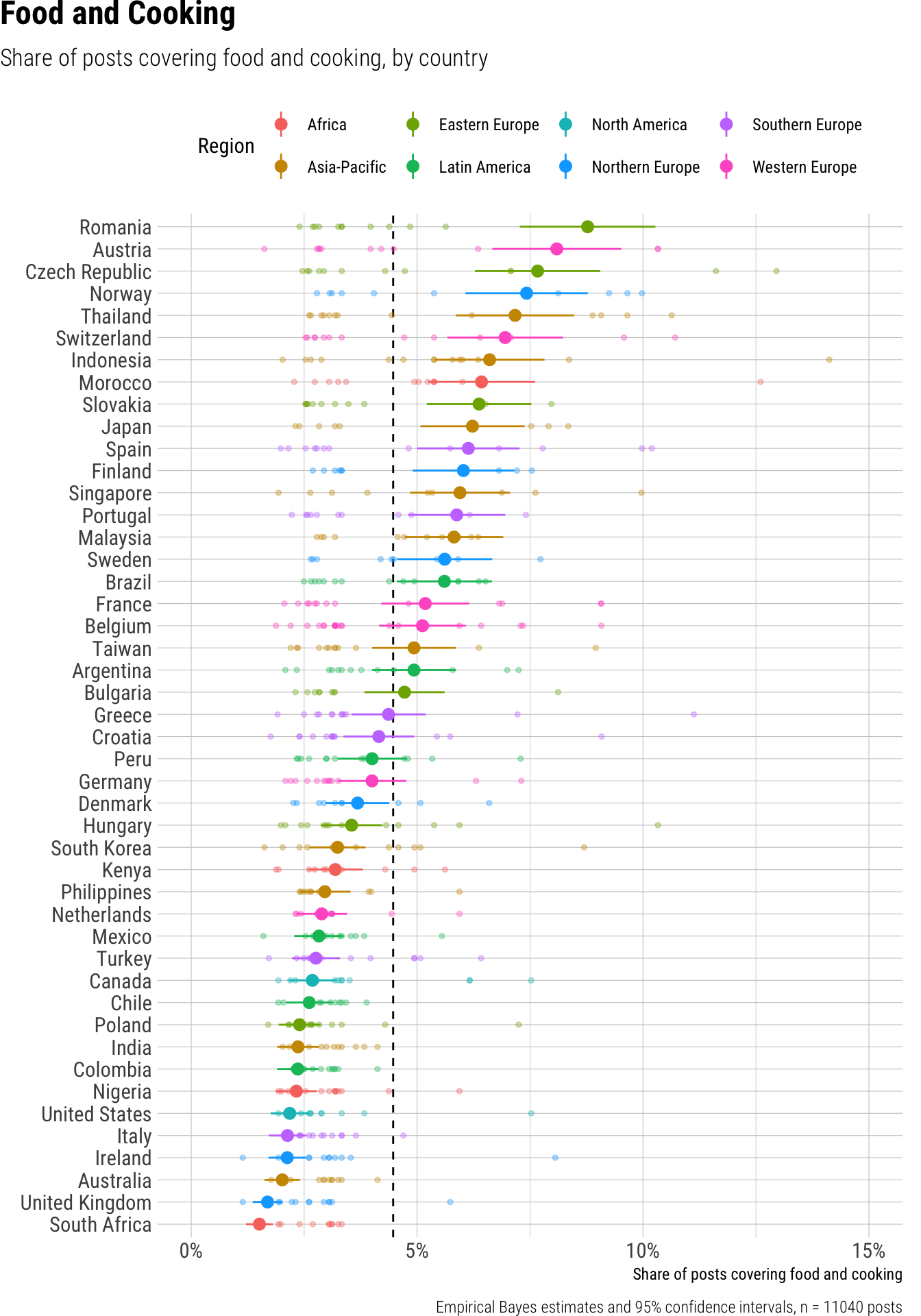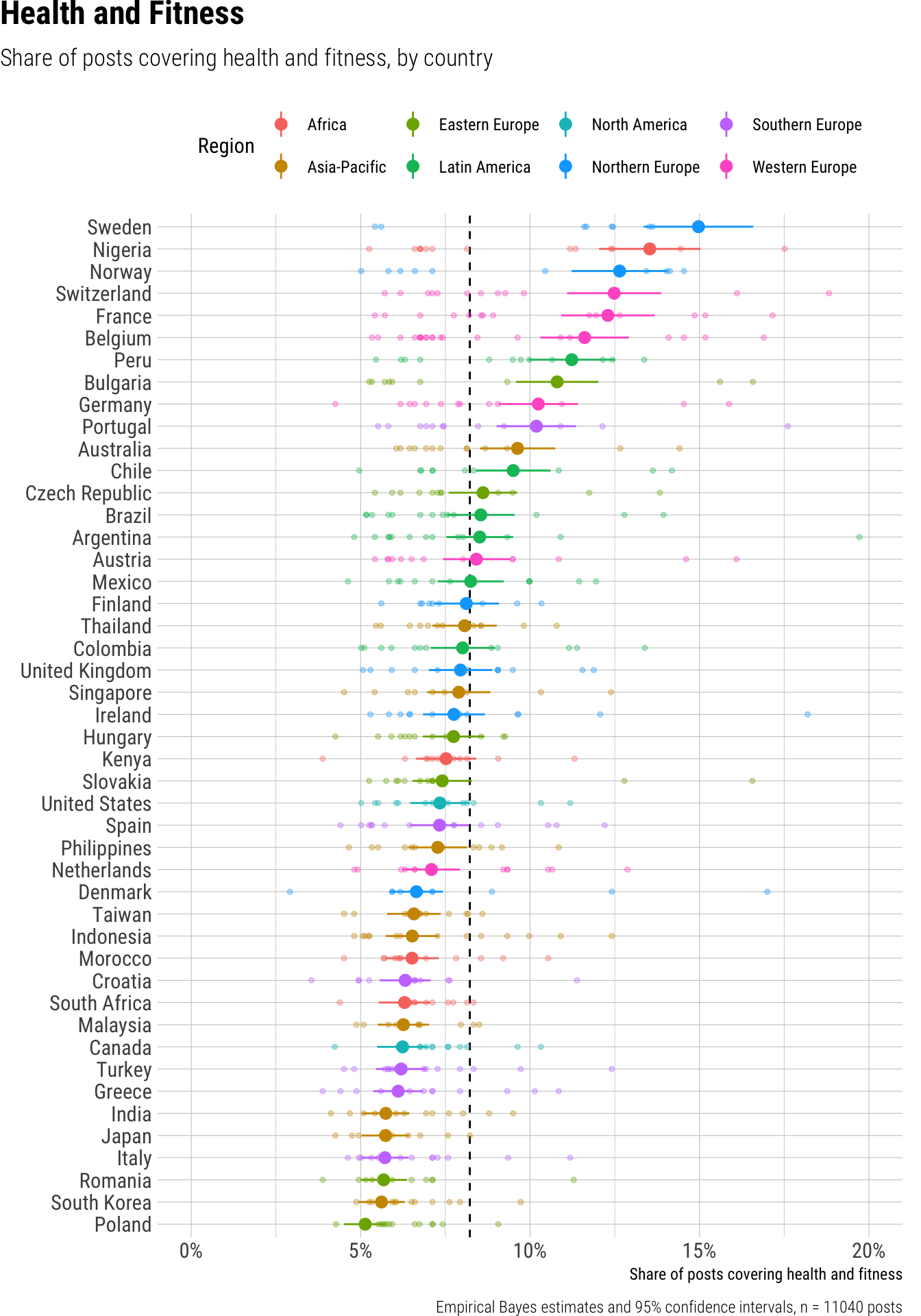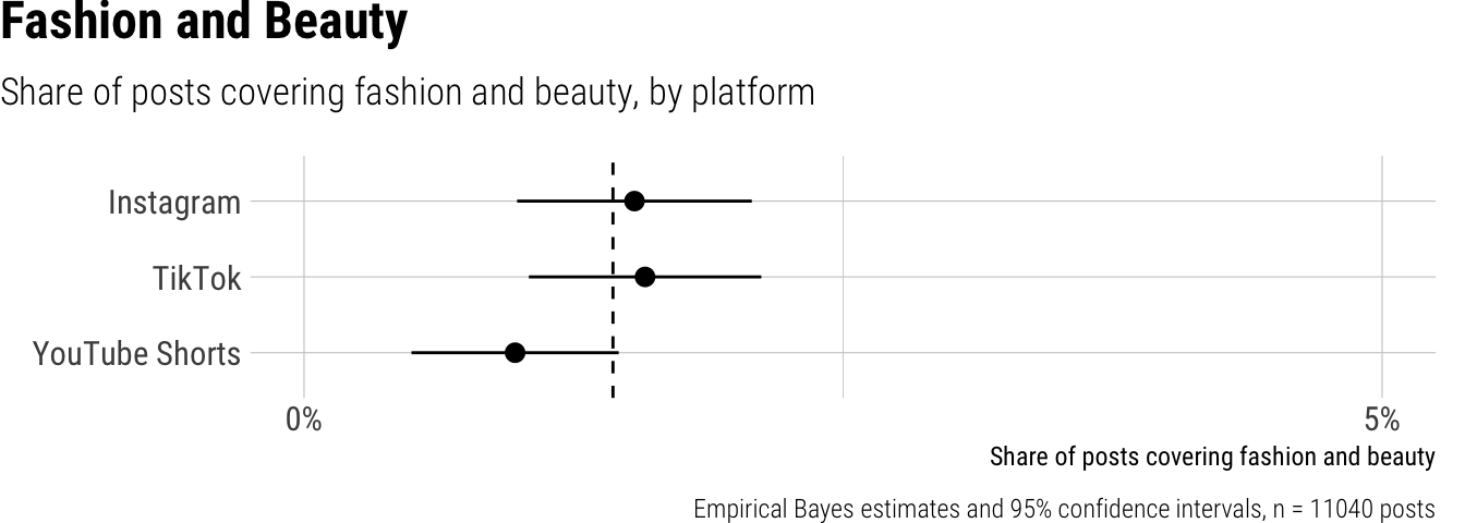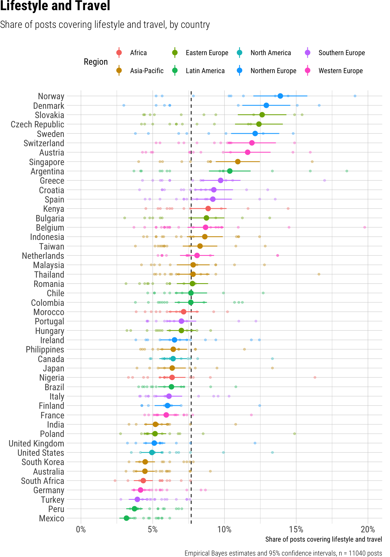 Across news outlets, an average of 16% of short video posts covered social affairs. While differences across platforms were generally small, we observed that Instagram posts contained slightly more social affairs content at 17% compared to YouTube Shorts at 15%, with TikTok at 16% falling in between. More notable differences emerged when examining outlet types: public broadcasters dedicated a significantly larger share of their posts to social affairs, at 21%, whereas digital outlets posted the least at 14%, with print and private broadcasters both around 16%. Country-level variations were substantial, ranging from a low of 9% in Taiwan and 10% in Greece and the Philippines, to a high of 29% in Nigeria, followed by 25% in Bulgaria and 24% in Germany.