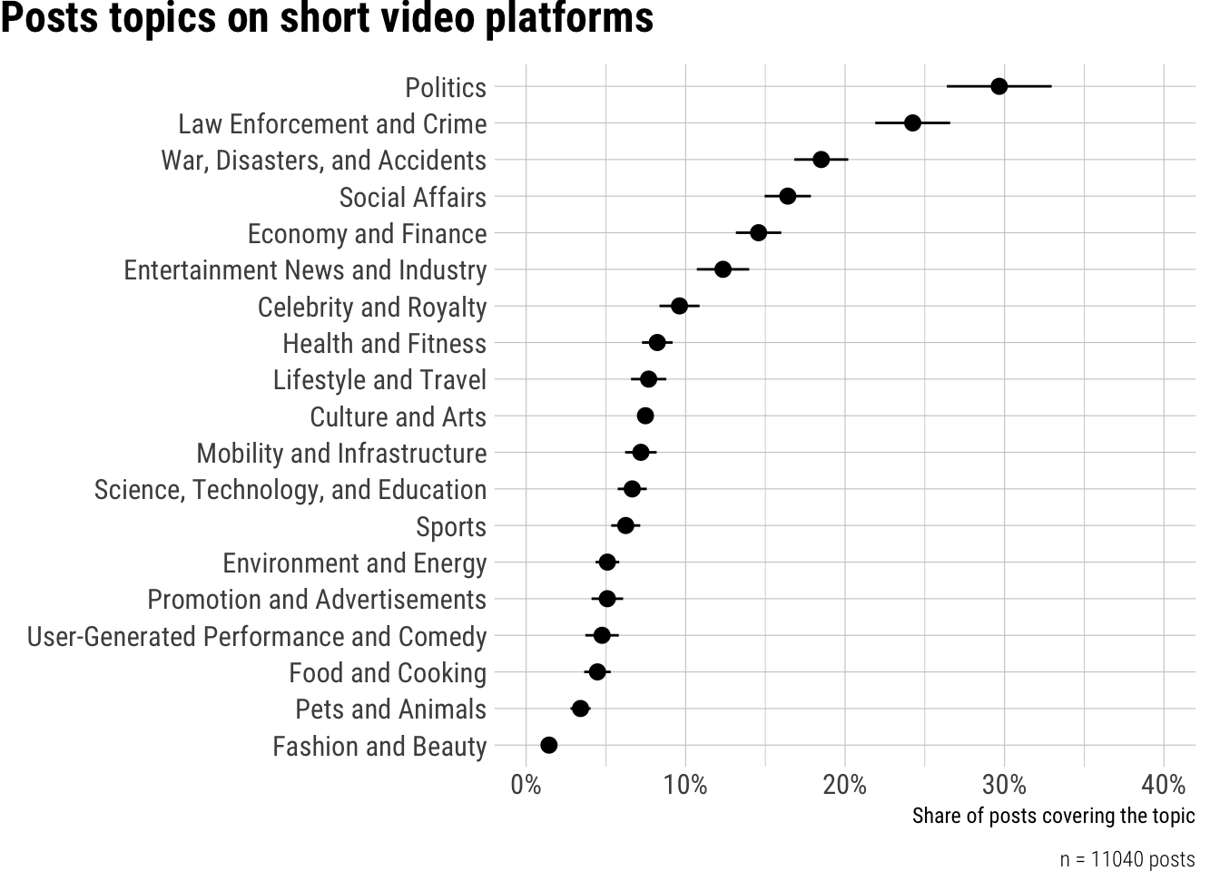 Looking at the overall distribution of topics, hard news such as politics and crime clearly dominate, while typical platform topics like fashion or animals as well as comedy and performance videos are relatively rarely published by news outlets.